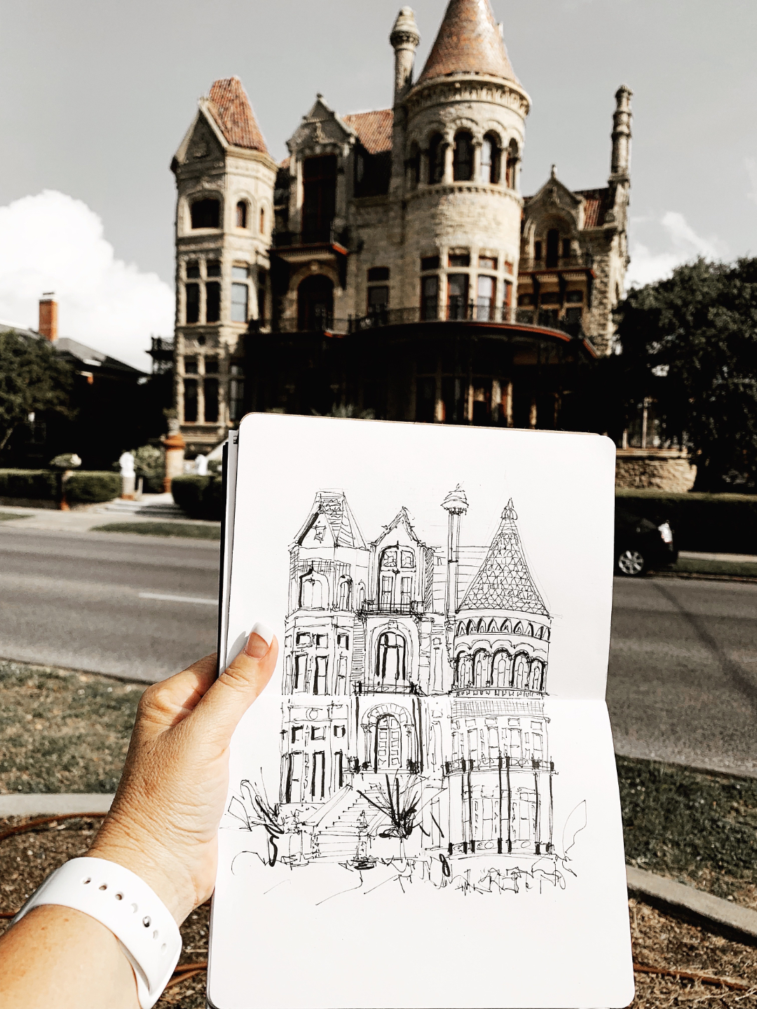 You’re standing in front of a historic building in Galveston, sketchbook open, pen in hand.
